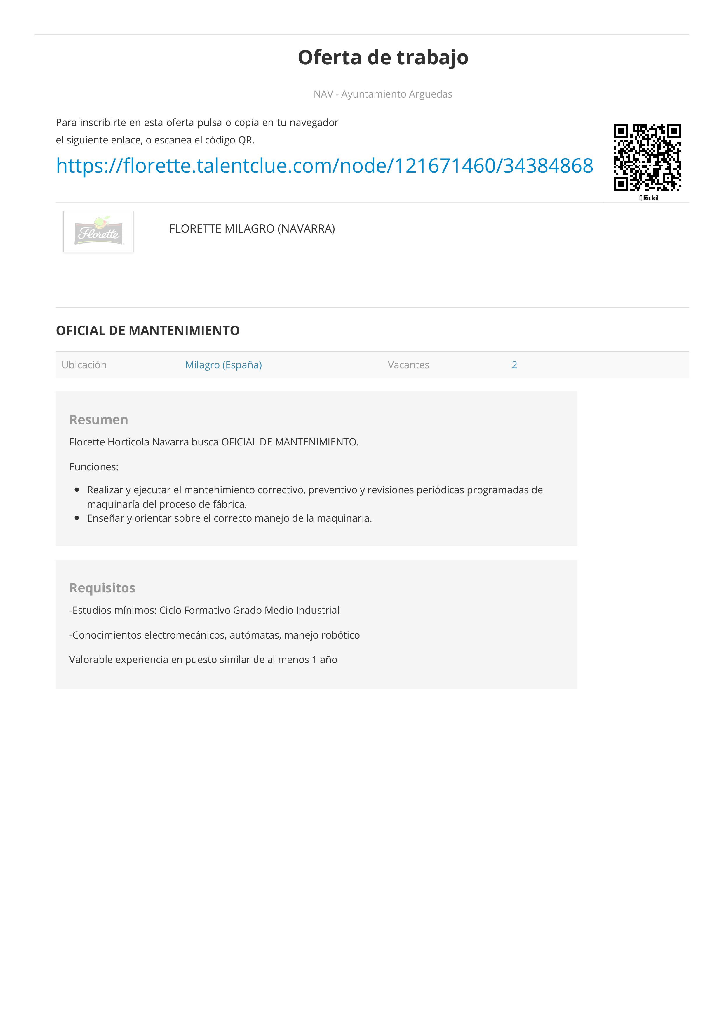 Florette Horticola Navarra busca OFICIAL DE MANTENIMIENTO.