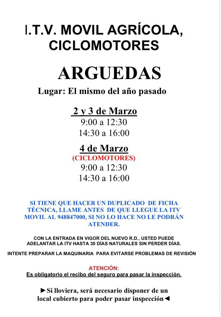 Días: 2 y 3, y 4 de marzo (ciclomotores). Es obligatorio el recibo del seguro para pasar la inspección.