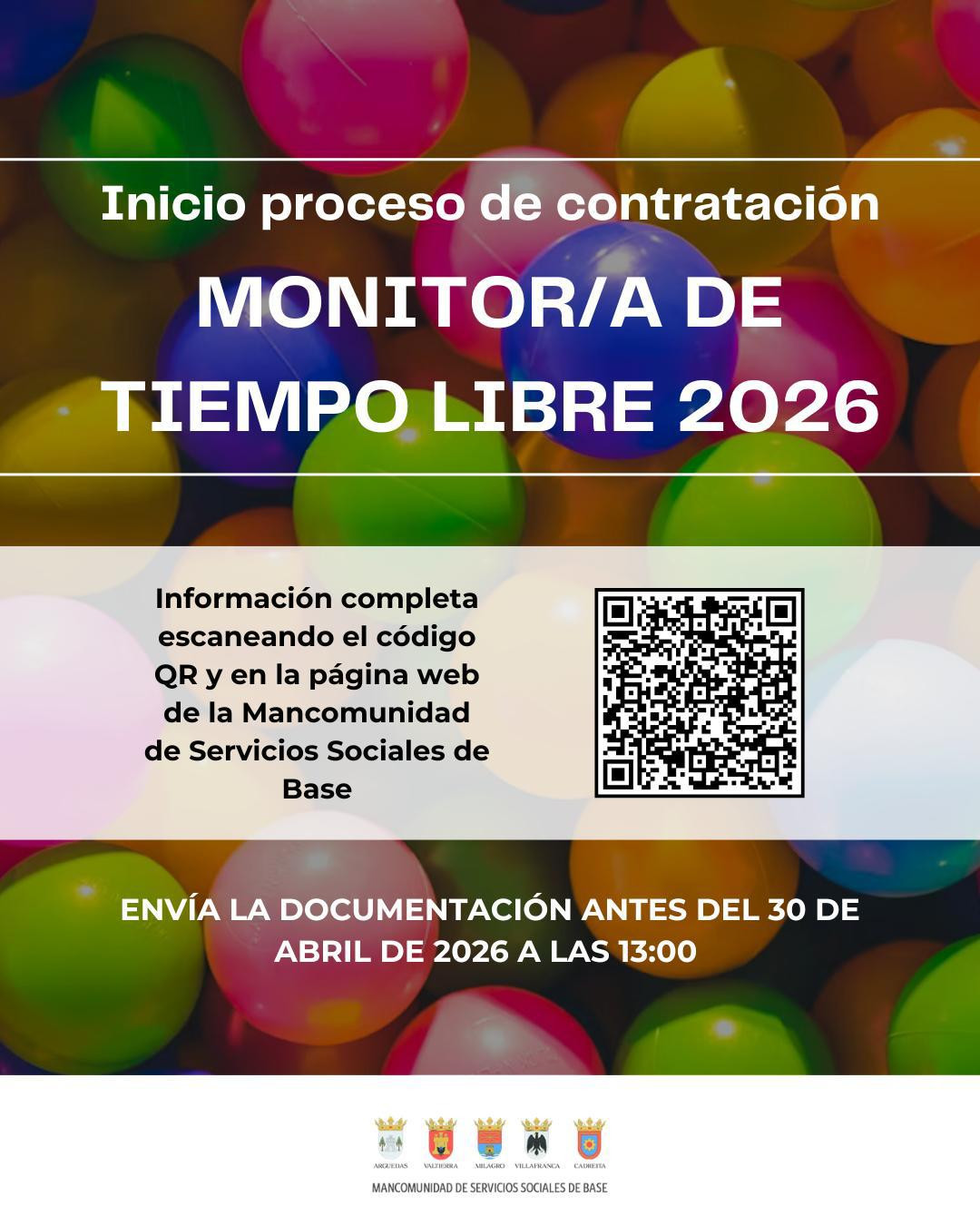 Monitor/a de tiempo libre 2026. Enviar la documentación antes del 30 de abril a las 13:00 horas.